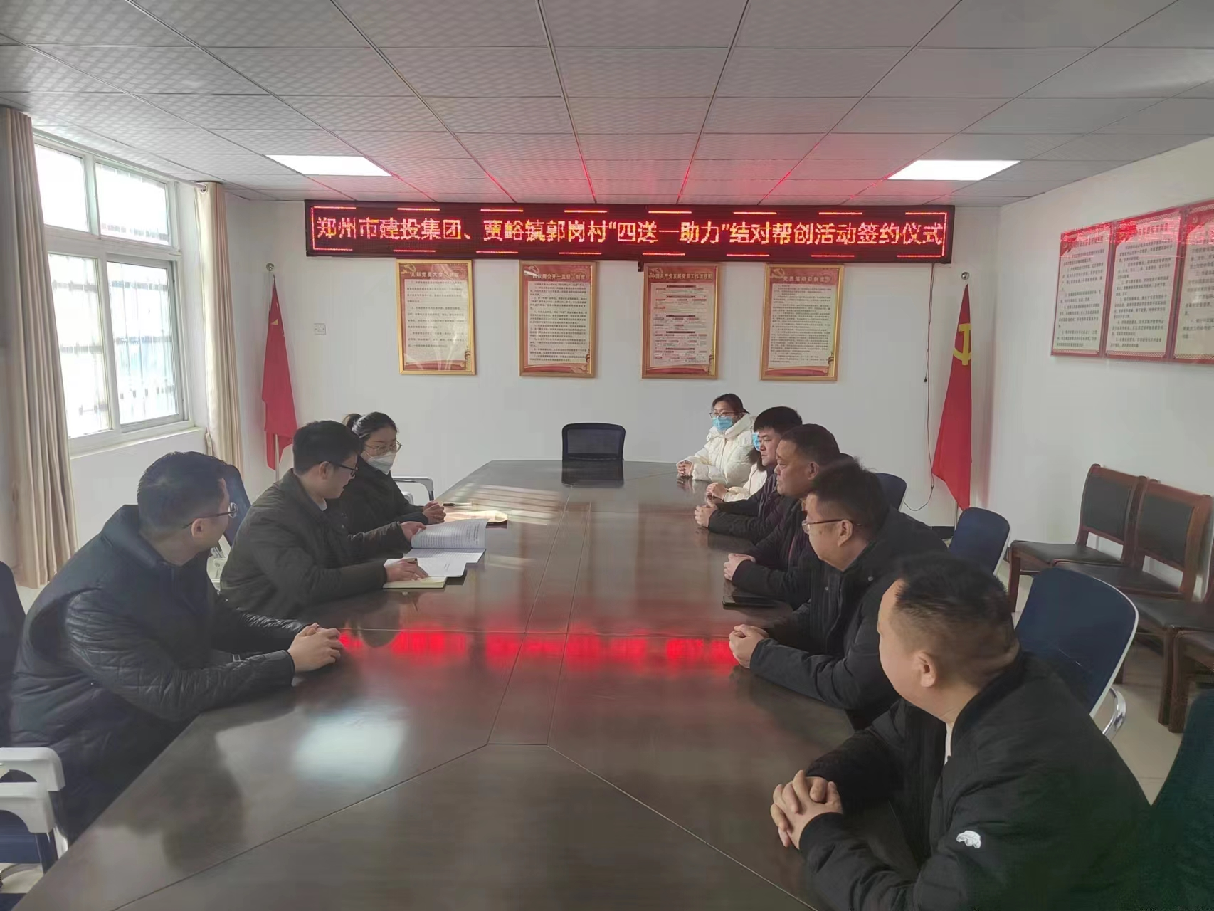 深入調(diào)研,制定幫扶內(nèi)容“聚合力”。幫創(chuàng)工作組首先與郭崗村“兩委”相關(guān)負責(zé)人、村民代表進行座談交流,村支書張建華詳細介紹了郭崗村鄉(xiāng)村振興、鞏固脫貧攻堅成果、“五星”黨支部創(chuàng)建等工作。趙少先表示,自2017年鄭州市第四輪文明單位結(jié)對幫扶開始,建投集團與郭崗村結(jié)成幫扶對子,雙方在幫扶農(nóng)村精神文明創(chuàng)建工作中結(jié)下了深厚的友誼,大家一起同心協(xié)力真抓實干,繪就了鄉(xiāng)村振興新景色。在今后的工作中,建投集團將會一如既往地做好堅強后盾,提供力所能及的幫助。隨后,雙方就本輪幫創(chuàng)工作目標(biāo)、具體措施、完成時限進行了深入探討。趙少先指出,建投集團將結(jié)合郭崗村幫創(chuàng)需求,通過崇德向善、建設(shè)文化強村;情系群眾、惠民修路先行;智能安防、守護鄉(xiāng)村平安等措施助力鄉(xiāng)村振興,同時常態(tài)化開展好“送政策、送文化、送健康、送溫暖”等志愿服務(wù)活動,預(yù)計3年共提供幫扶資金15萬元,將“四送一助力”結(jié)對幫創(chuàng)工作做實做細。最后,雙方共同簽署了《鄭州市各級文明單位“四送一助力”結(jié)對幫創(chuàng)活動協(xié)議書》,正式建立幫創(chuàng)關(guān)系。