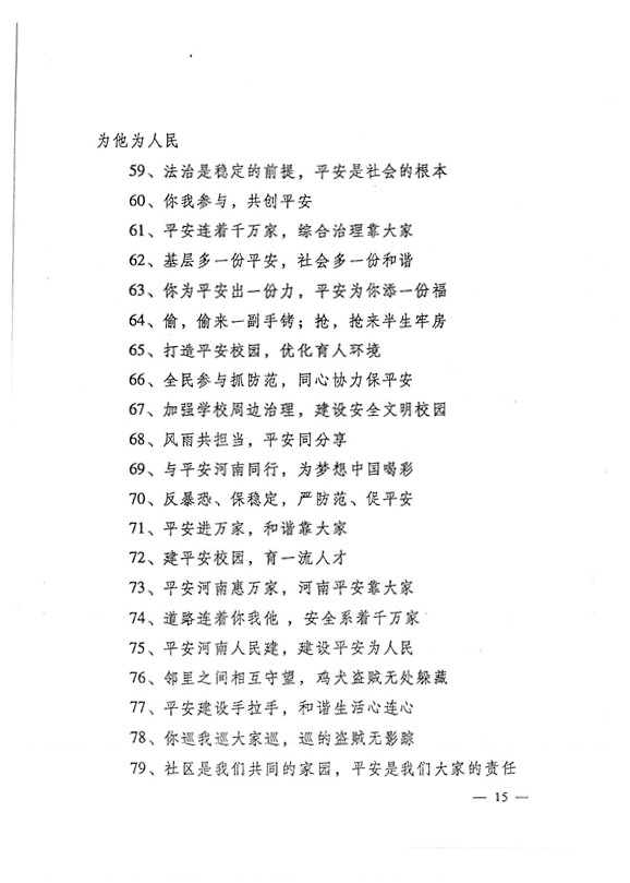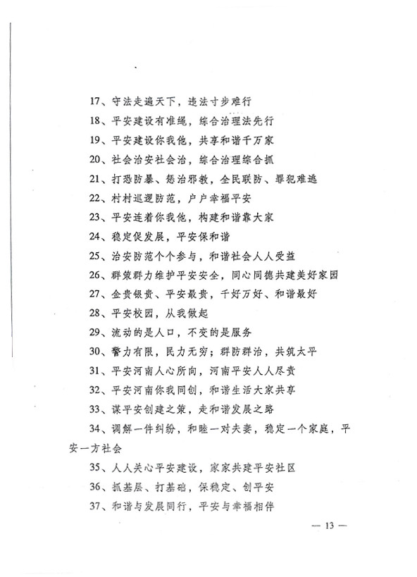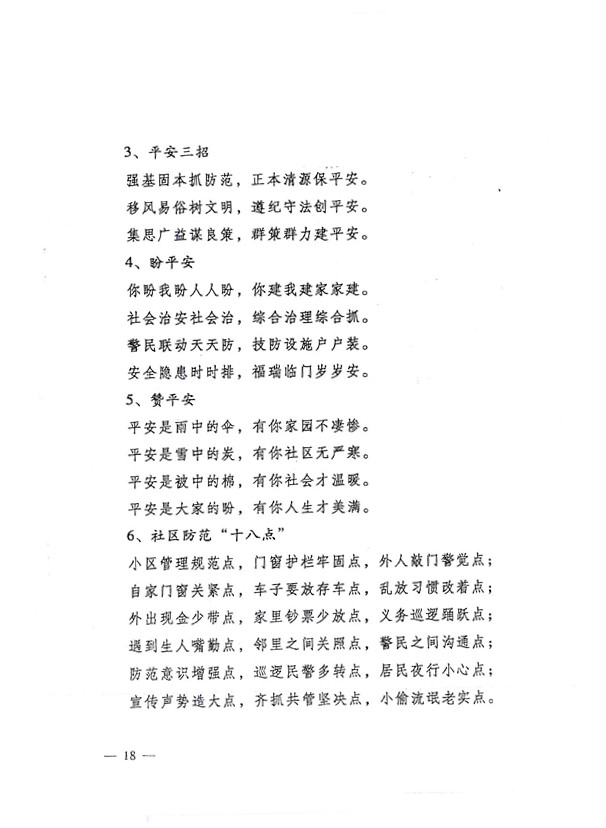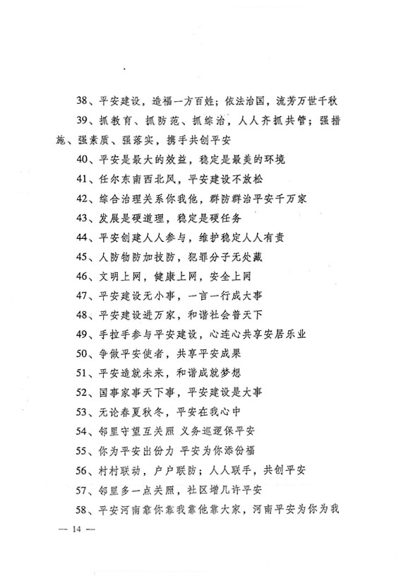 平安兩字重千斤,社會(huì)穩(wěn)定得民心。 創(chuàng)建平安人人有責(zé),構(gòu)建和諧人人參與。
